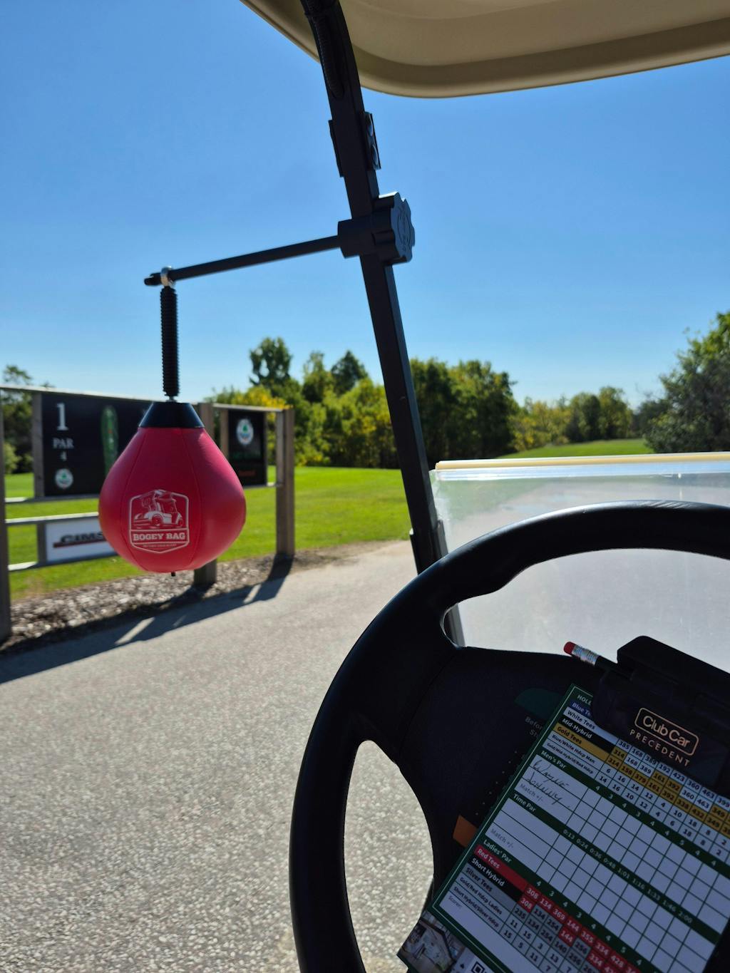Besides being an unique attraction on the golf course (especially at tournaments), it is a real stress reliever. Bad shot - hit the bag. It is amazing how much it can take that edge off. Very clever... By the way, the golf cart servers love hitting it when they get shafted (not tipped) by the foursome ahead of you.